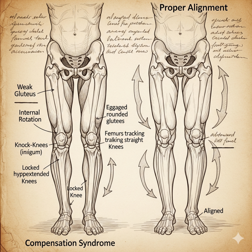 - 腹部與臀部失守: 當核心和臀大肌沒有撐起骨盆,骨盆會前移,迫使膝蓋進入超伸狀態來維持站立。