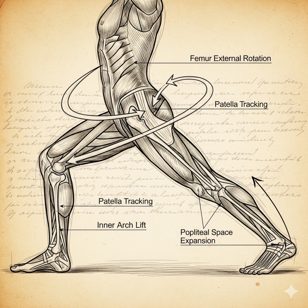 - 螺旋啟動: 站立時,感覺大腿骨從根部微微向外旋開。這能同時解決「過直」與「內扣」——外旋會迫使膝蓋解鎖,並重新撐起足弓。