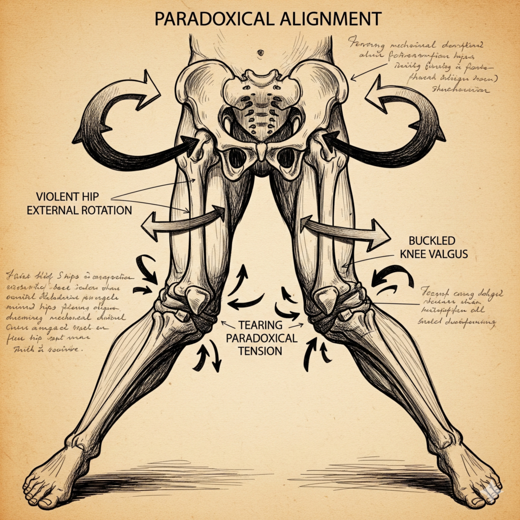 這通常發生在:妳的深層轉子肌群(想外旋)與闊筋膜張肌/內收肌(拉動內扣)正在打架。這會讓膝蓋軟骨承受極大的扭轉壓力,長期下來會導致半月板與韌帶的慢性耗損。
