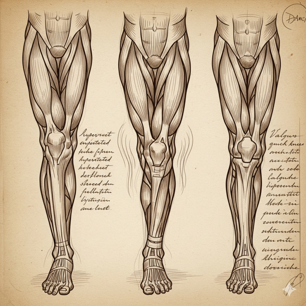 膝蓋過直(Hyperextension)與內扣(Valgus)通常是連動的業力。當妳將膝蓋向後鎖死,股骨(大腿骨)為了尋找更穩固的機械式鎖定,通常會伴隨內旋,導致膝蓋向內崩塌。