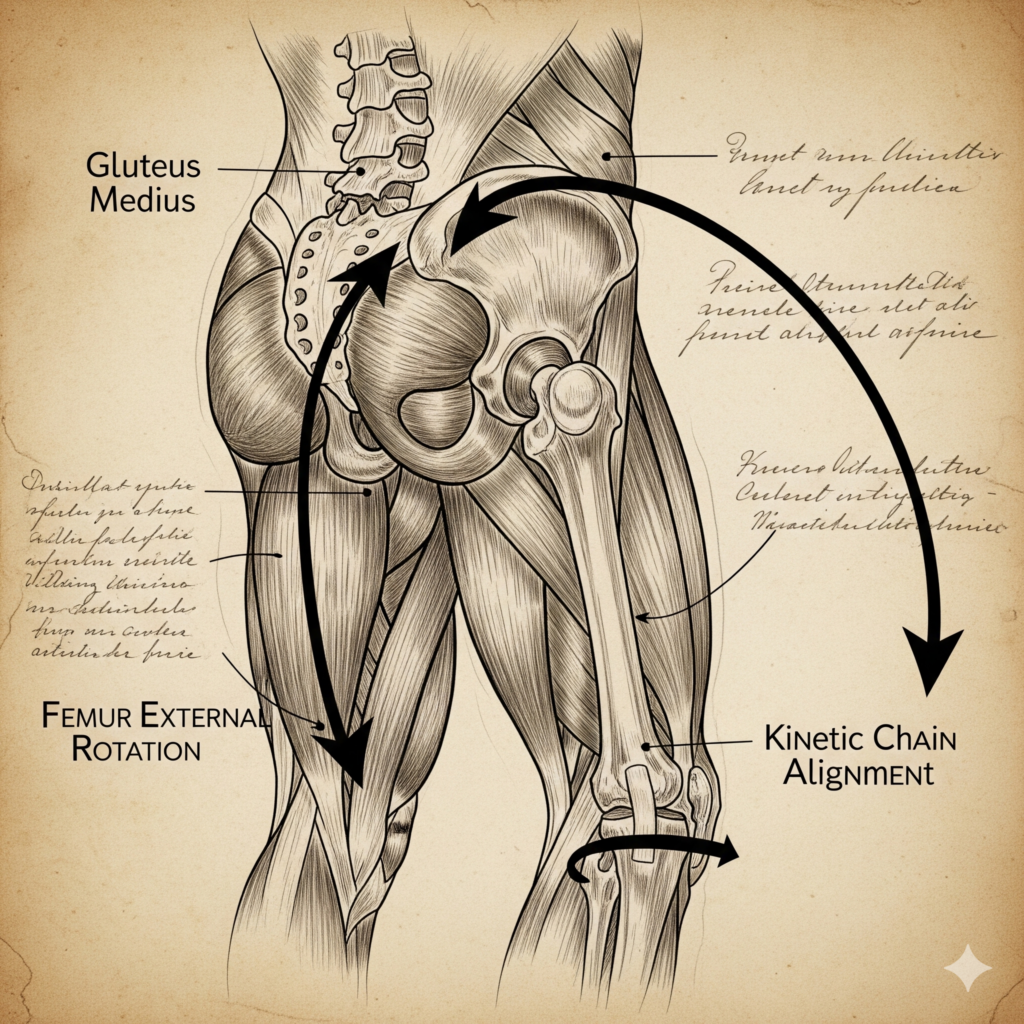 - 臀中肌無力: 臀中肌負責髖關節的外展與外旋。當它無力時,大腿骨會失去向外拉的力量,導致膝蓋向內塌陷。