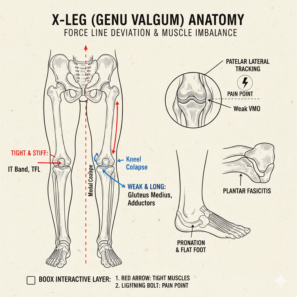 - 足部: 常伴隨扁平足或足內翻(Pronation),足弓塌陷帶動膝蓋內扣。常伴隨拇指外翻