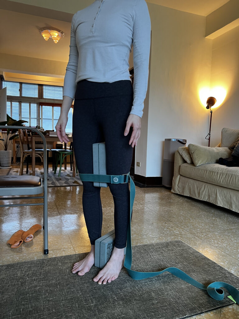- 夾磚練習: 在所有站姿(如山式、幻式)中,在大腿內側夾一塊瑜伽磚,強迫內收肌群啟動,從內部撐開膝蓋空間。